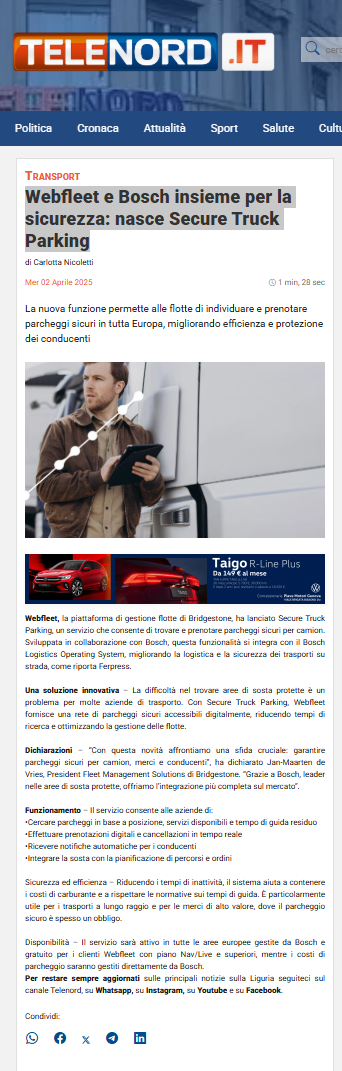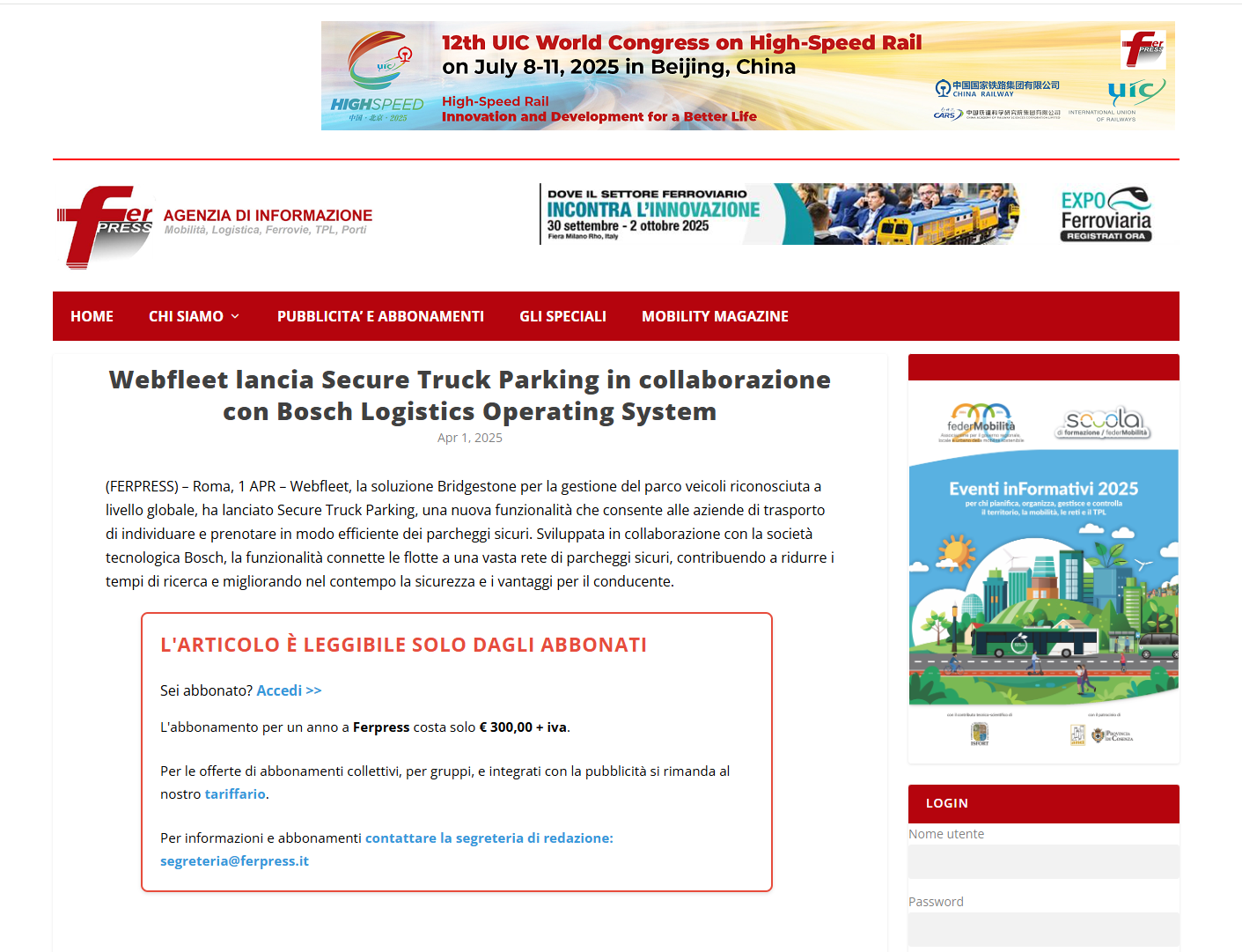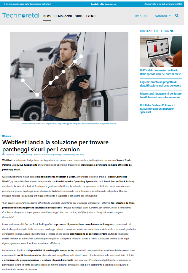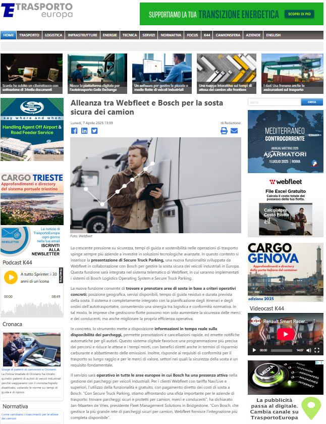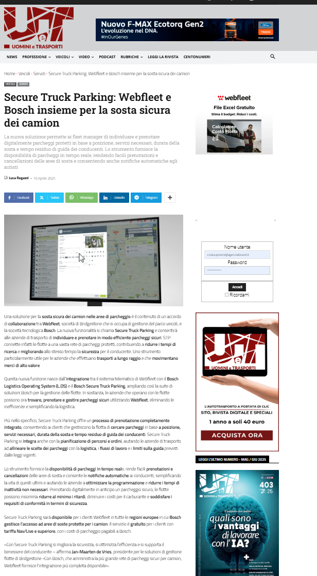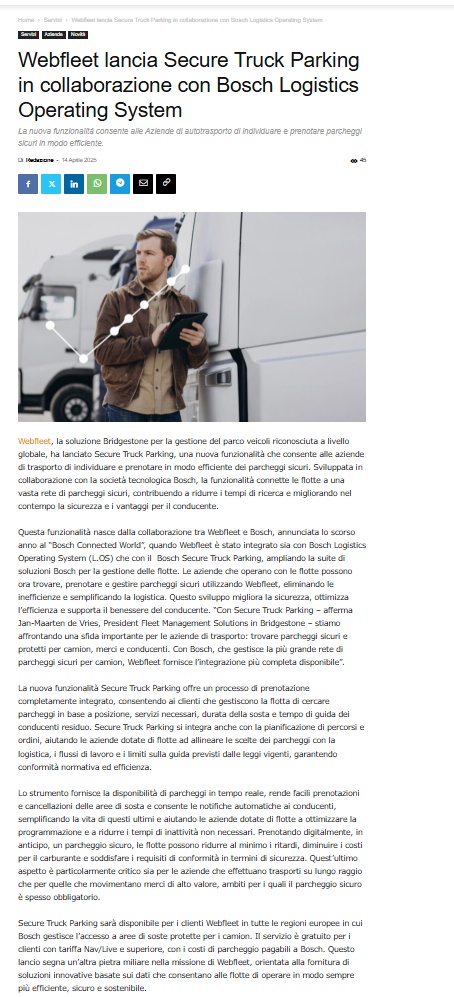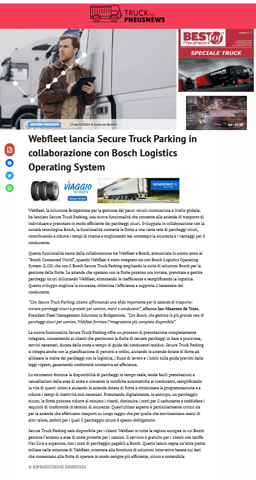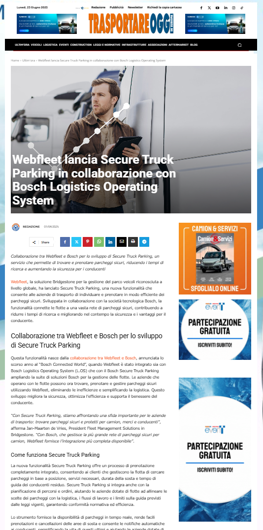 Webfleet e Bosch insieme per la sicurezza: nasce Secure Truck Parking