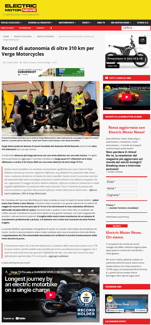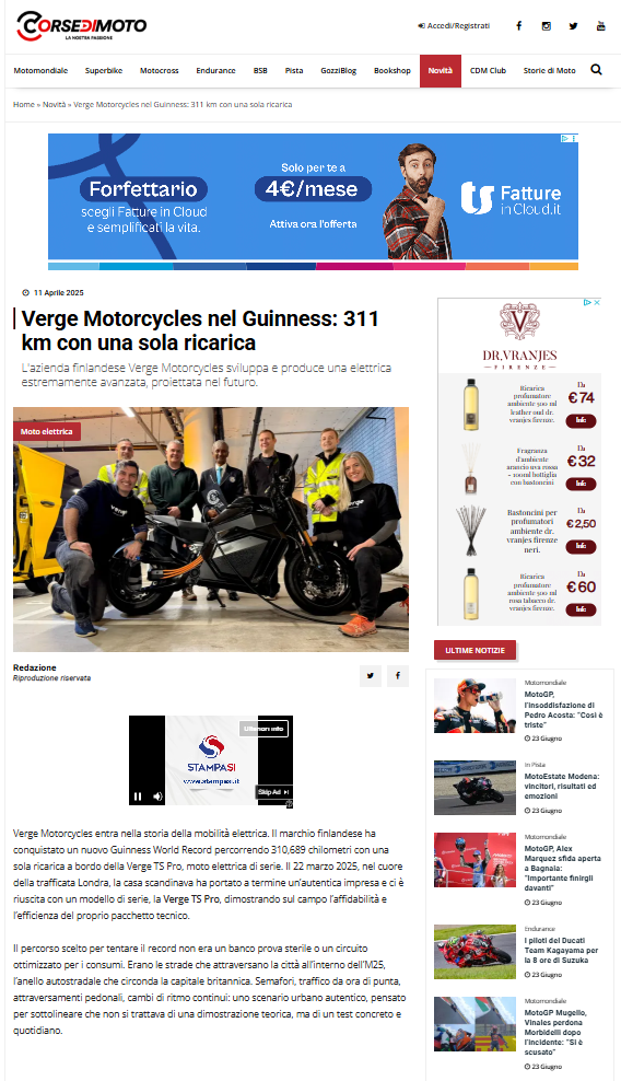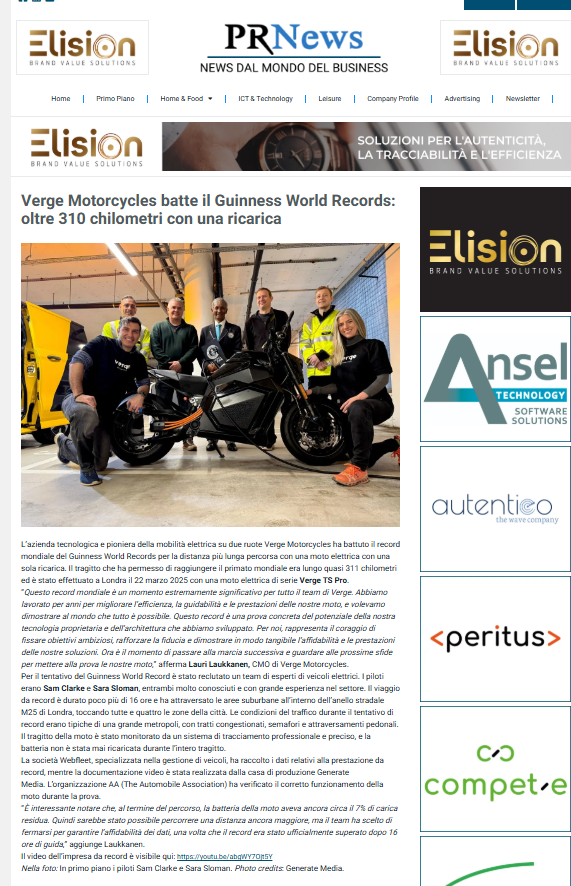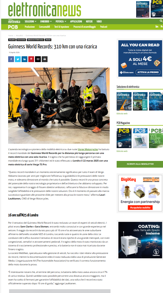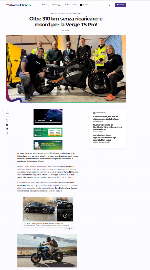 Verge Motorcycles batte il Guinness World Records: oltre 310 chilometri con una ricarica