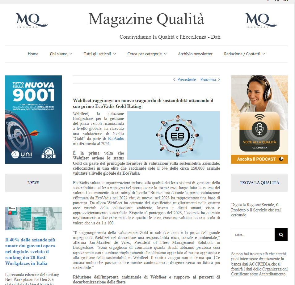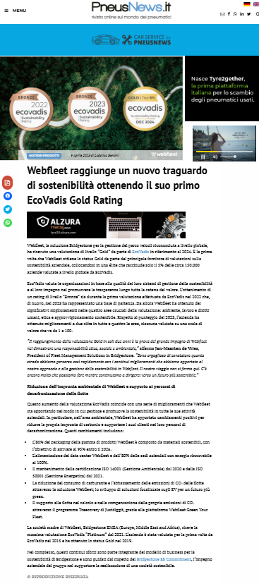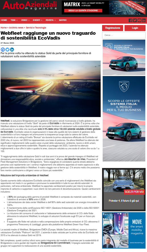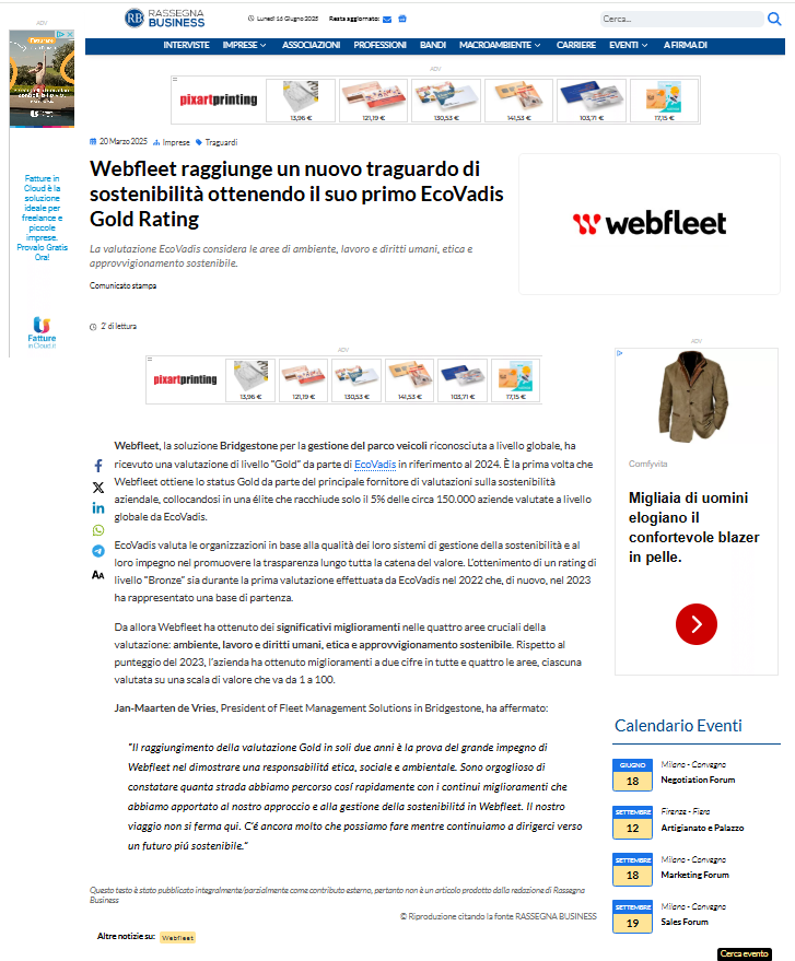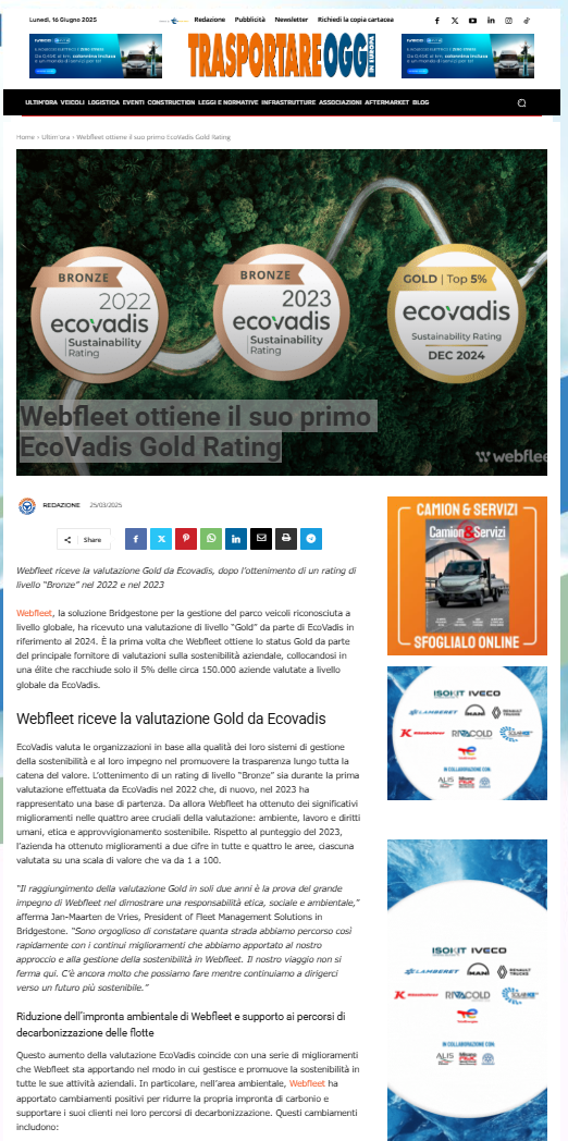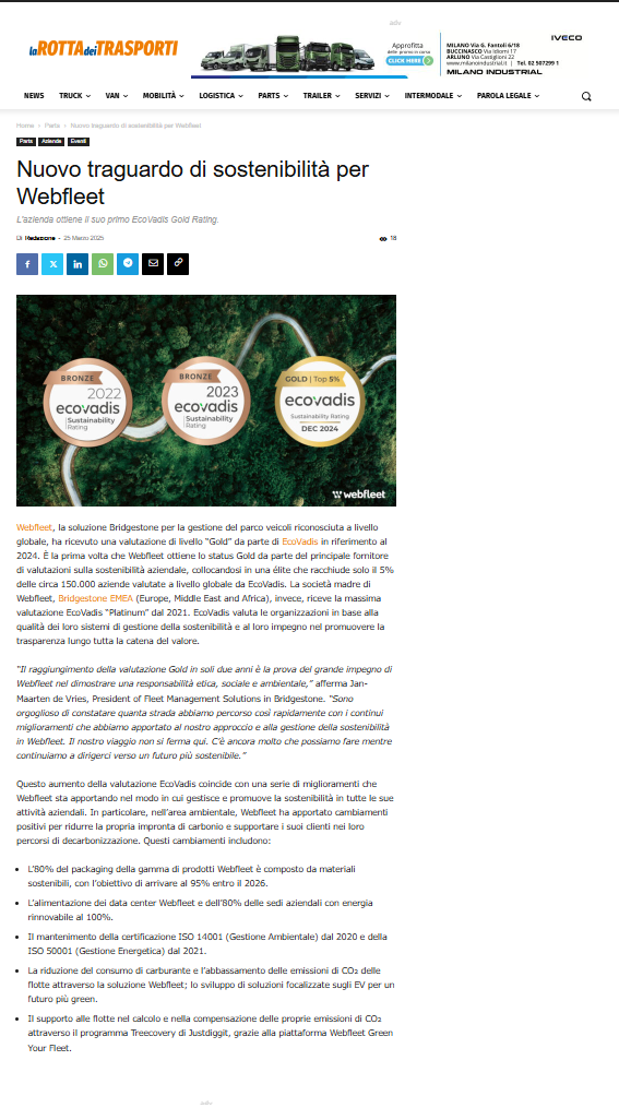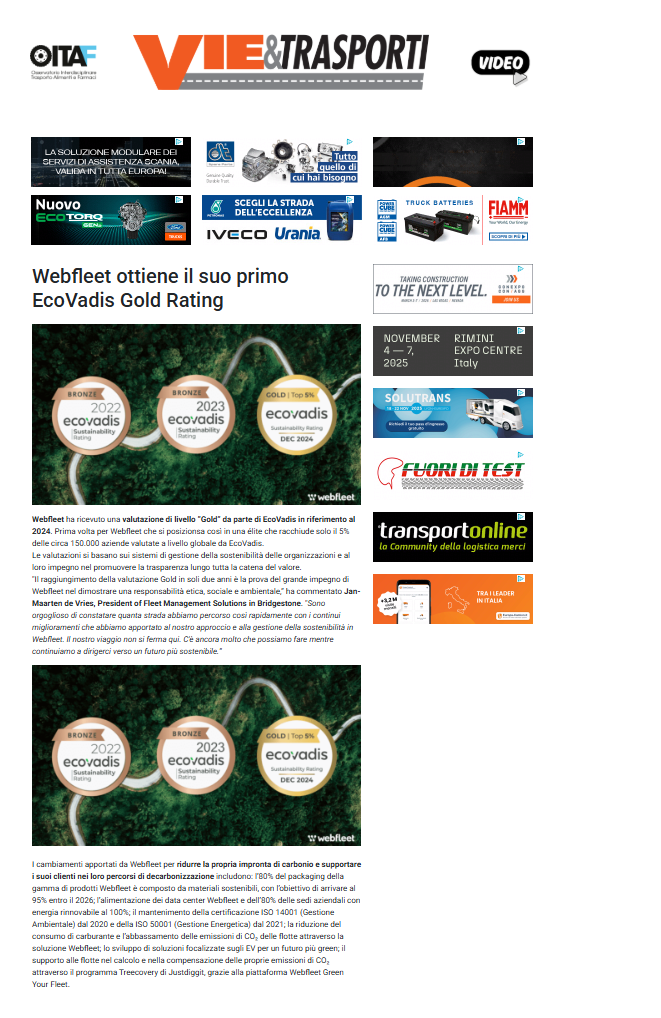 Webfleet raggiunge un nuovo traguardo di sostenibilità ottenendo il suo primo EcoVadis Gold Rating
