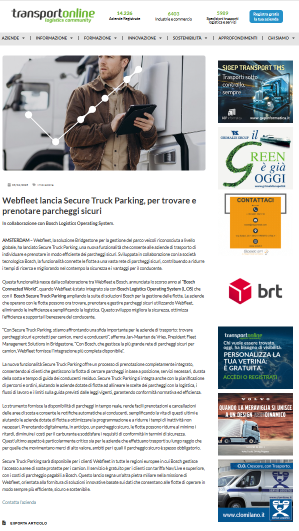 Webfleet lancia Secure Truck Parking in collaborazione con Bosch Logistics Operating System